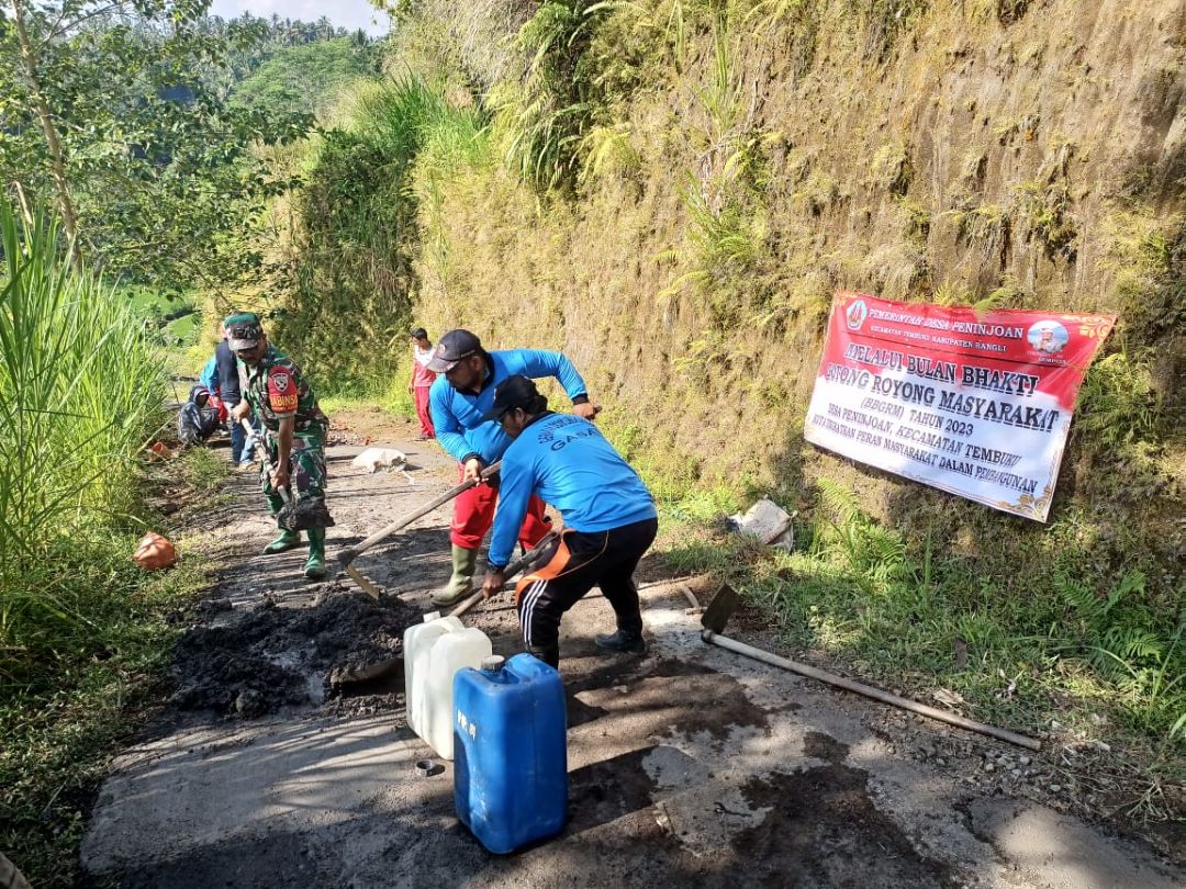 “kegiatan yang dilakukan pada Bulan Bhakti Gotong Royong Masyarakat (BGGRM) tahun 2023 ini yaitu memperbaiki jalan di wilayah Desa Peninjoan yang rusak akibat hujan,” ucap Sertu I Made Suarnika”.