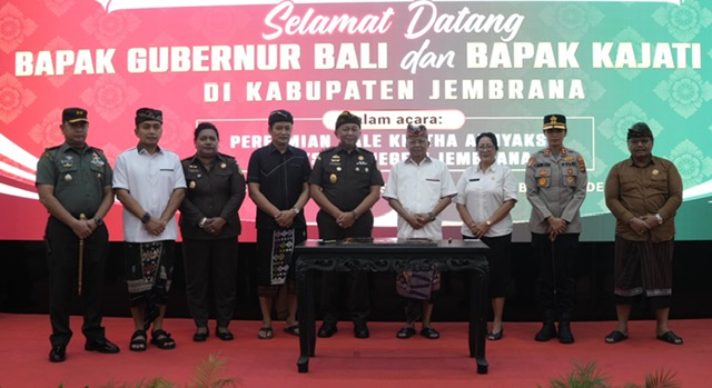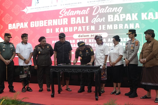 Jembrana – Bupati Jembrana I Made Kembang Hartawan mendampingi Kepala Kejaksaan Tinggi Bali, Dr. Ketut Sumedana, dan Gubernur Bali, I Wayan Koster, meresmikan secara serentak Bale Kertha Adhyaksa di 51 Desa/Kelurahan dan 64 Desa Adat se-Kabupaten Jembrana. Peresmian ini digelar di Ballroom Gedung Kesenian Ir. Soekarno, Rabu (11/6/2025) dengan mengusung tema “Optimalisasi Peran Kejaksaan dalam Membangun Desa.”