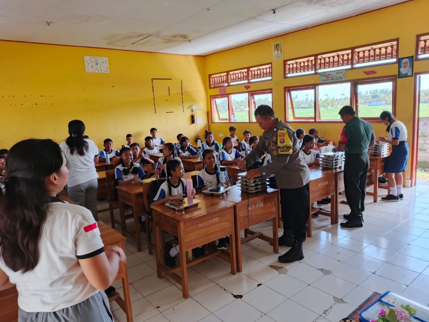 Keterangan Foto : Bersinergi Dengan Babinsa, Bhabinkamtibmas Polres Jembrana Pantau Pembagian Makanan Bergizi Di SMPN 2 Mendoyo