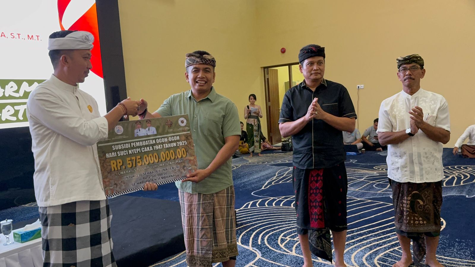 Jembrana – Pemerintah Kabupaten Jembrana secara simbolis menyerahkan Bantuan Keuangan Khusus (BKK) kepada Desa Adat se-Kabupaten Jembrana serta subsidi pembuatan Ogoh-Ogoh kepada Sekaa Teruna Teruni (STT) dalam sebuah acara di Ballroom Gedung Kesenian Dr. Ir. Soekarno, Sabtu (8/3/2025).