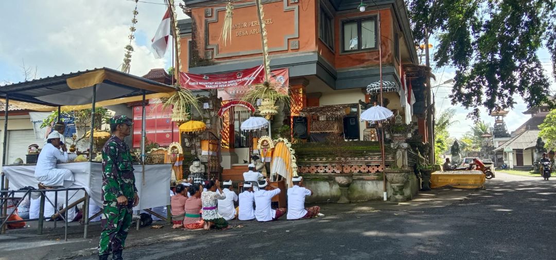 Persembahyangan dalam rangka kegiatan upacara penyineban rangkaian dari upacara ngresigana Babinsa desa Apuan Koramil 1626-02/Susut Kodim 1626/Bangli Sertu I Nyoman Suharta Seperti biasanya melaksanakan kegiatan pengamanan demi kenyamanan warga binaan saat melaksanakan kegiatan keagamaan, Bertempat di Pura Kantor Desa Apuan, Senin, (22/5/23).