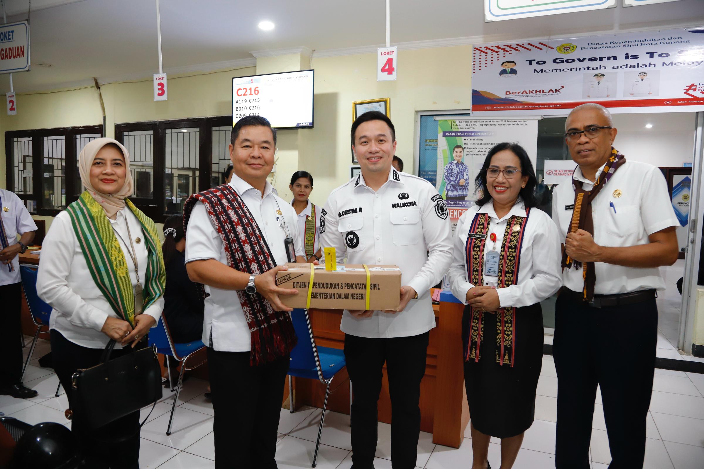 Sementara itu, Wali Kota Kupang Christian Widodo menyampaikan rasa syukur dan apresiasinya atas kunjungan kerja Dirjen Dukcapil dan seluruh tim. “Kami merasa bangga dan bersyukur atas kunjungan ini. Terima kasih Pak Dirjen atas perhatiannya untuk Kota Kupang. Bahkan kami langsung diberi 4.000 keping blanko KTP elektronik saat itu juga, ini sangat membantu,” ungkap Wali Kota.