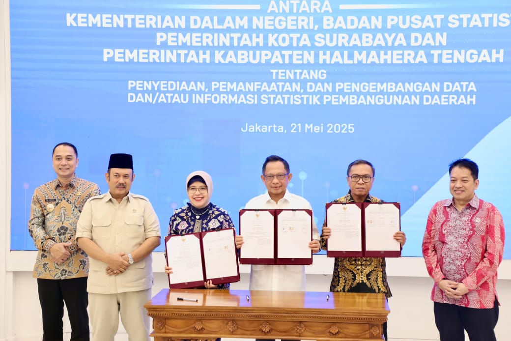 Jakarta – Menteri Dalam Negeri (Mendagri) Muhammad Tito Karnavian menandatangani kerja sama dengan Badan Pusat Statistik (BPS), Pemerintah Kota Surabaya, dan Pemerintah Kabupaten Halmahera Tengah. Kerja sama tersebut mencakup penyediaan, pemanfaatan, dan pengembangan data serta informasi statistik pembangunan daerah.