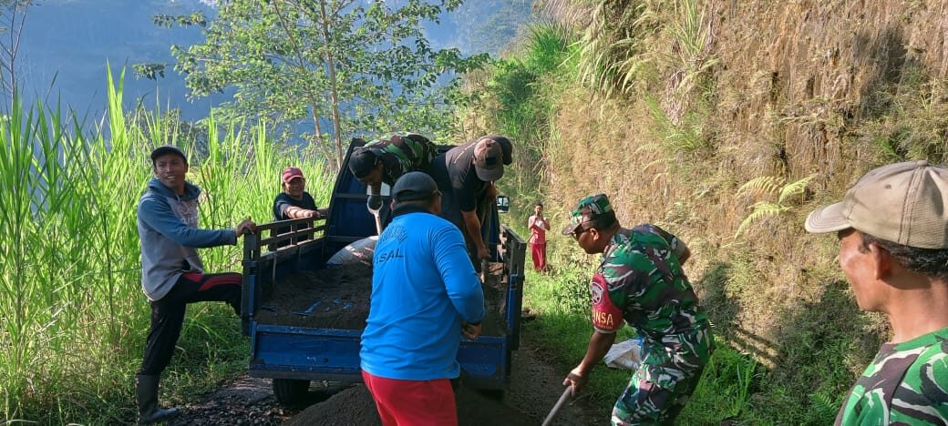 Untuk menjalin kebersamaan TNI dengan Rakyat Babinsa Peninjoan Koramil 1626-03/Tembuku Kodim 1626/Bangli Gotong Royong bersama Warga perbaikan jalan, Sabtu (27/5/2023)