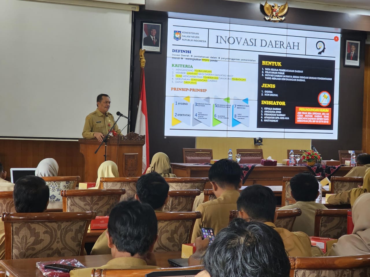 “(Undang-Undang menjamin) Bapak dan Ibu yang akan melakukan inovasi yang telah dicatatkan dalam keputusan Kepala Daerah apabila belum mencapai tujuan dari inovasi itu tidak dipandang sebagai pelanggaran. Ini merupakan privilege yang diberikan untuk Bapak dan Ibu tidak ragu-ragu lagi untuk melakukan inovasi,” jelasnya.