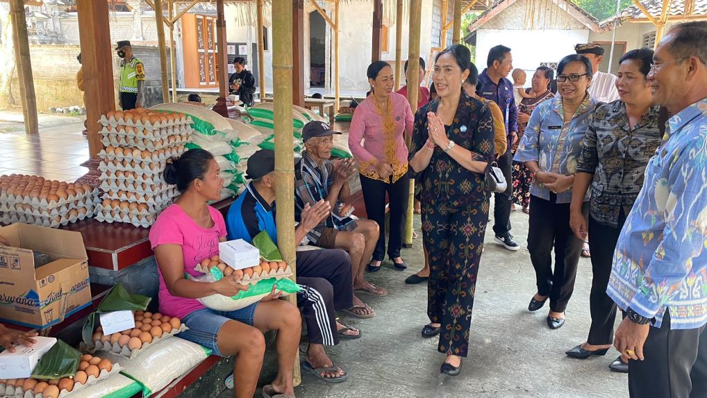 Ketua Tim Penggerak Pembinaan Kesejahteraan Keluarga (TP PKK) Kabupaten Jembrana, Ny. Candrawati Tamba membagikan sembako kepada para lansia sebagai bentuk kepedulian terhadap warga yang telah lanjut usia dan warga disabilitas di kecamatan Mendoyo, Selasa (20/6).
