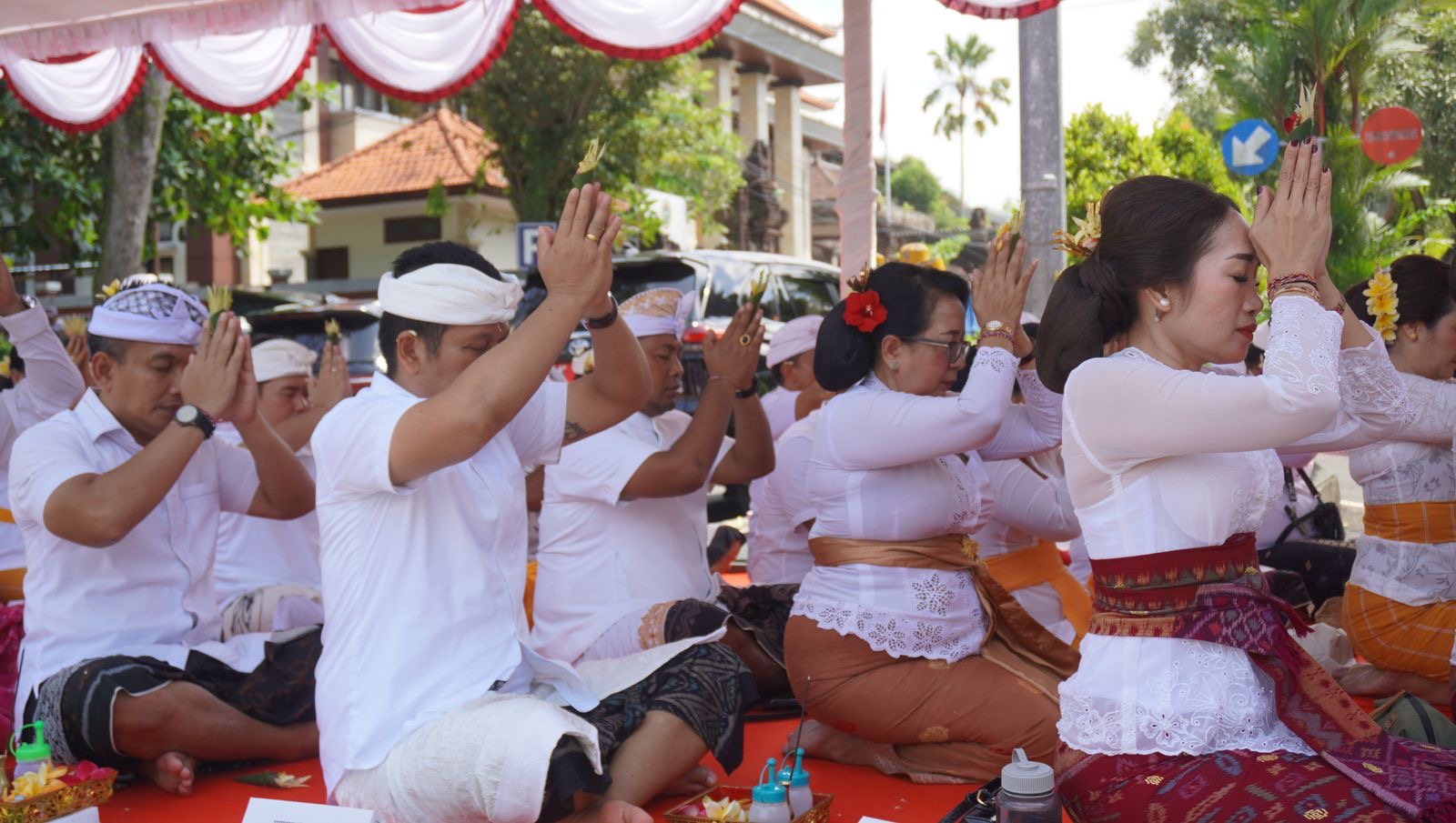 Bupati Jembrana I Made Kembang Hartawan bersama Wabup IGN Patriana Krisna beserta istri masing-masing, Perwakilan Foprkopimda, Para Kepala OPD, unsur PHDI dan jajarannya turut hadir mengikuti persembahyangan