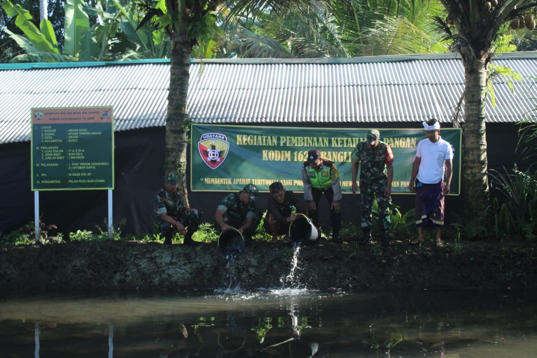 Dalam rangka untuk mendukung program ketahanan pangan Tahun 2023, Babinsa Desa Abuan Kecamatan Susut Koramil 1626-02/Susut Pelda I Putu Budi Utama dan Babinsa Desa Demulih Sertu I Gede Sukadana menghadiri kegiatan penaburan benih bibit ikan nila di Kolam ikan Demplot Banjar Abuan desa Abuan bersama dengan Tiga Pilar desa Abuan Kecamatan Susut Kabupaten Bangli pada Kamis, (4/5/2023).