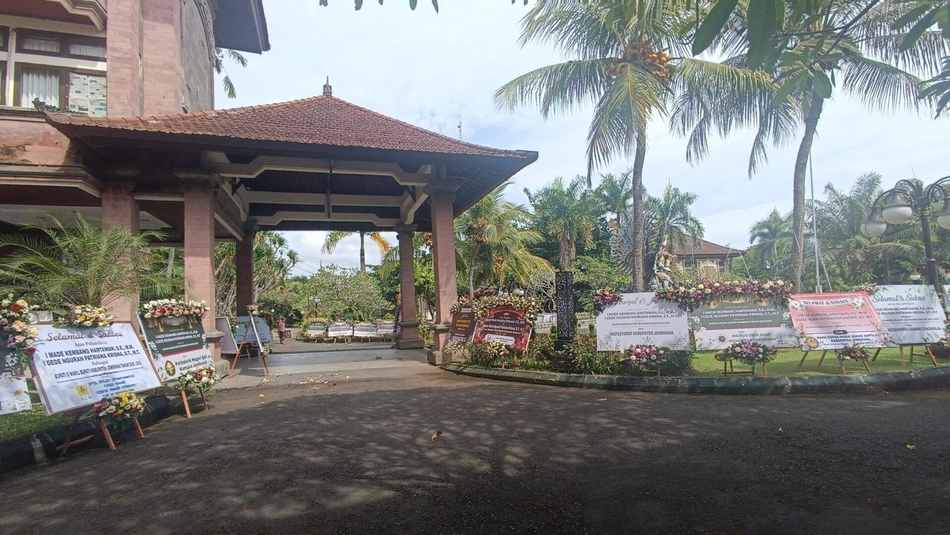 Ucapan selamat mengalir dari berbagai kalangan. Tampak ucapan karangan bunga memenuhi halaman depan Kantor Bupati Jembrana.
